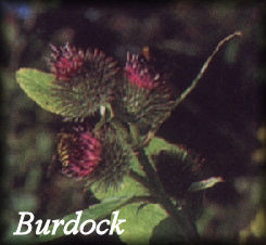 Burdock, also known as Great Burdock, is a member of the thistle family. It has large, heartshaped leaves with purple flowers and it can grow as large as two feet long and one foot wide.